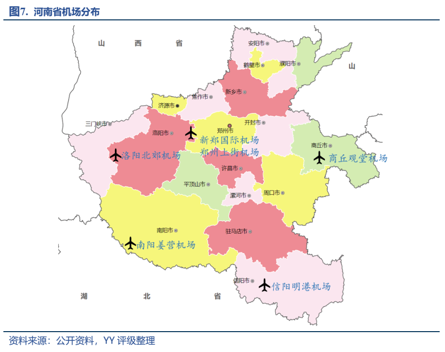 除了密集交錯的鐵路、公路線外,地處內陸的河南為了走出去,2013年建立了鄭州航空港經濟綜合實驗區(qū),開始了問天要路的發(fā)展之旅。航空港區(qū)內的新鄭機場作為中國八大區(qū)域性樞紐機場之一,借助于港區(qū)強大的手機終端生產能力,在貨郵吞吐量中排名全國第七;同時2.5小時的航空圈可覆蓋全國人口的90%,旅客吞吐量排名全國十二,航空樞紐地位顯著。另外除了新鄭,省內還有其他5個機場分別位于洛陽、南陽、商丘、信陽,完善補充了全省的航空體系。