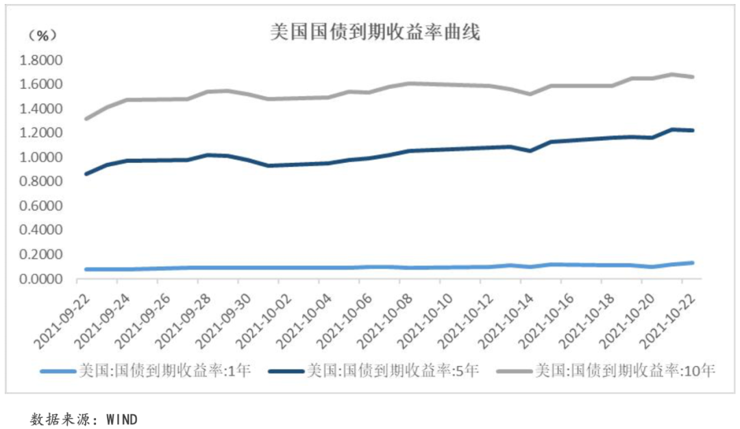 本周,美國(guó)公布數(shù)據(jù)顯示美國(guó)高通脹仍將持續(xù)運(yùn)行,各期限美債收益率紛紛上漲。具體來看,本周1年期、5年期和10年期美國(guó)國(guó)債平均收益率較上周上漲0.65個(gè)BP、10.05個(gè)BP和8.10個(gè)BP至0.11%、1.19%和1.65%。