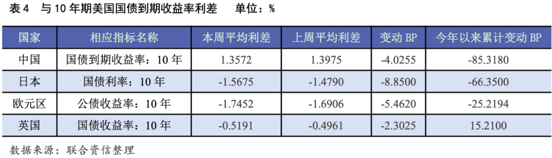 本周各期限中美國(guó)債平均收益率利差走勢(shì)不一,1年期中美國(guó)債平均收益率利差分別較上周走擴(kuò)2.20個(gè)BP至2.25%;5年期和10年期中美國(guó)債平均收益率利差分別較上周收窄4.26個(gè)和4.03個(gè)BP至1.68%和1.36%。本周1年期、5年期和10年期日美國(guó)債平均收益率利差分別較上周走擴(kuò)0.63個(gè)、10.20個(gè)和8.85個(gè)BP至-0.23%、-1.27%和-1.57%。本周1年期歐元區(qū)公債與相應(yīng)期限美債平均收益率利差分別較上周收窄1.80個(gè)BP至-0.82%;5年期和10年期歐元區(qū)公債與相應(yīng)期限美債平均收益率利差分別較上周走擴(kuò)3.77個(gè)和5.46個(gè)BP至-1.63%和-1.75%。本周5年期英美國(guó)債平均收益率利差分別較上周收窄2.54個(gè)BP至-0.33%;10年英美國(guó)債平均收益率利差分別較上周走擴(kuò)2.30個(gè)BP至-0.52%。