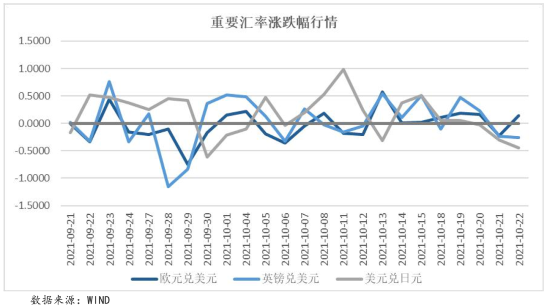 本周,在高通脹壓力以及美元受到打壓的背景下,歐元暫時(shí)保持升勢(shì)。本周歐元兌美元收于1.1642,周內(nèi)累計(jì)收漲0.34%。英國(guó)10月綜合PMI數(shù)據(jù)繼續(xù)上行,達(dá)到5月以來的最高位,企業(yè)復(fù)蘇勢(shì)頭強(qiáng)勁,支撐英鎊表現(xiàn)。本周英鎊兌美元收于1.3758,周內(nèi)累計(jì)收漲0.03%。本周,美元兌日元收于113.5000,周內(nèi)累計(jì)收跌0.66%。