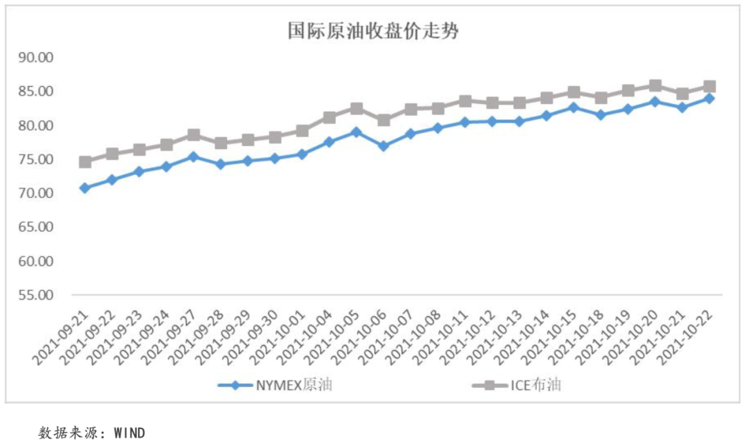 本周,國(guó)際油價(jià)繼續(xù)周內(nèi)全面上漲。一是隨著全球經(jīng)濟(jì)復(fù)蘇步伐的加快,石油需求顯著上升,如10月美國(guó)和歐元區(qū)PMI制造業(yè)和服務(wù)業(yè)活動(dòng)指數(shù)仍然高于50,經(jīng)濟(jì)活動(dòng)仍在擴(kuò)張;二是隨著亞洲市場(chǎng)對(duì)石油需求的上升(韓國(guó)11月原油購(gòu)買量創(chuàng)下歷史最高水平),當(dāng)下的石油供給結(jié)構(gòu)將進(jìn)一步緊張。三是各國(guó)能源儲(chǔ)備逐漸下降的基礎(chǔ)上,OPEC+仍保持原計(jì)劃產(chǎn)出,供應(yīng)趨緊??傮w來看,在供應(yīng)不足的條件下,強(qiáng)勁的需求拉動(dòng)石油價(jià)格上揚(yáng)。截至本周五收盤,NYMEX原油價(jià)格收于83.98美元/桶,周內(nèi)累計(jì)收漲2.41%;ICE布油價(jià)格收于85.77美元/桶,周內(nèi)累計(jì)收漲0.97%。