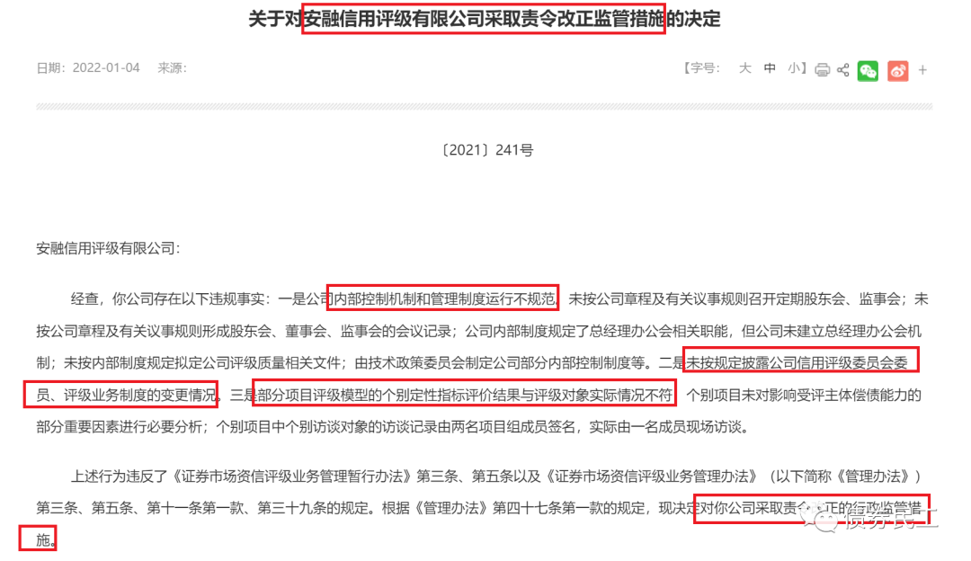 根據(jù)北京證監(jiān)局2022年1月4日的公開信息,安融信用評(píng)級(jí)有限公司(以下簡稱“安融評(píng)級(jí)”)因?yàn)閮?nèi)部控制機(jī)制和管理制度運(yùn)行不規(guī)范、未按規(guī)定披露公司信用評(píng)級(jí)委員會(huì)委員及評(píng)級(jí)業(yè)務(wù)制度的變更情況、部分項(xiàng)目評(píng)級(jí)模型的個(gè)別定性指標(biāo)評(píng)價(jià)結(jié)果與評(píng)級(jí)對(duì)象實(shí)際情況不符等原因,被證監(jiān)局采取責(zé)令改正監(jiān)管措施,成為2021年最后一家被監(jiān)管機(jī)構(gòu)采取監(jiān)管措施的評(píng)級(jí)機(jī)構(gòu)。