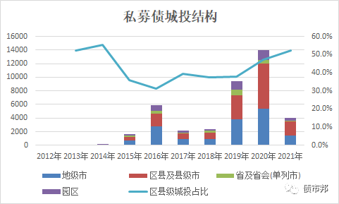 更加精確的說,交易所是選擇大力發展低層次城投發行人,區縣級城投私募債發行占比逐年攀升,目前占比已經將近50%。作為對比,2020年區縣級城投公司債中的占比僅為9%。這個差異說明,需要上報證監會注冊的一般公司債和僅需要交易所備案的私募債雖然都叫公司債,但其管理思路是有大不同的,不能混為一談。