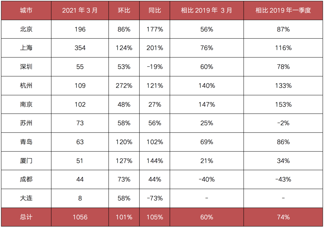 具體到城市來看,10城環比漲幅皆超50%,其中杭州、青島、廈門更是漲幅翻倍。同比來看,整體顯示漲多跌少,北京、廈門同比漲幅分別高達177%和144%最為亮眼,深圳受政策調控影響回落19%。值得一提的是,政策調控后上海二手房成交規模依舊高量,3月成交354萬平方米,同比翻2倍,較2019年同期也增76%。