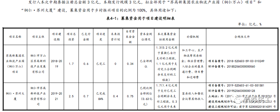 根據(jù)募集說(shuō)明書(shū)披露的信息,本次中期票據(jù)的用途為用于“蘇高新集團(tuán)農(nóng)業(yè)物流產(chǎn)業(yè)園(銅仁萬(wàn)山)項(xiàng)目”和“銅仁·蘇州大廈”建設(shè)。募投項(xiàng)目項(xiàng)目均位于貴州省銅仁市武陵山片區(qū)區(qū)域發(fā)展與扶貧攻堅(jiān)示范區(qū),全部用于支付與鄉(xiāng)村振興相關(guān)的鞏固拓展扶貧攻堅(jiān)成果項(xiàng)目的剩余工程款項(xiàng)。