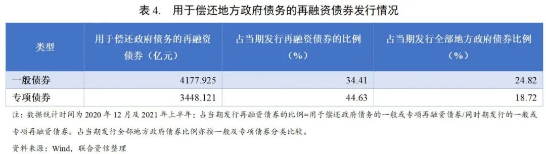 2020年12月及2021年上半年,用于償還政府債務的一般債券和專項債券分別為4177.93億元和3448.12億元,分別占同期發行再融資債券的比例為34.41%和44.63%,分別占同期發行全部地方政府債券的比例為24.82%和18.72%?;瘋猛緦m梻谠偃谫Y債券中的占比相對較高,或由于地方政府隱性債務的認定通常需要保證債務與公益性項目資產相對應,因此用于項目投資的專項債券或更適合對非債券形式的債務進行置換。