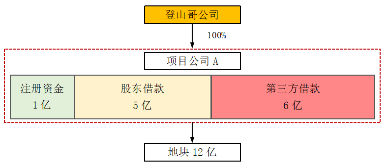#項目公司A注冊實繳資金一個1,為拿下某價值12個億的地塊,登山哥借款給項目公司5個億(股東借款),第三方融資借款6個億。示例如下: