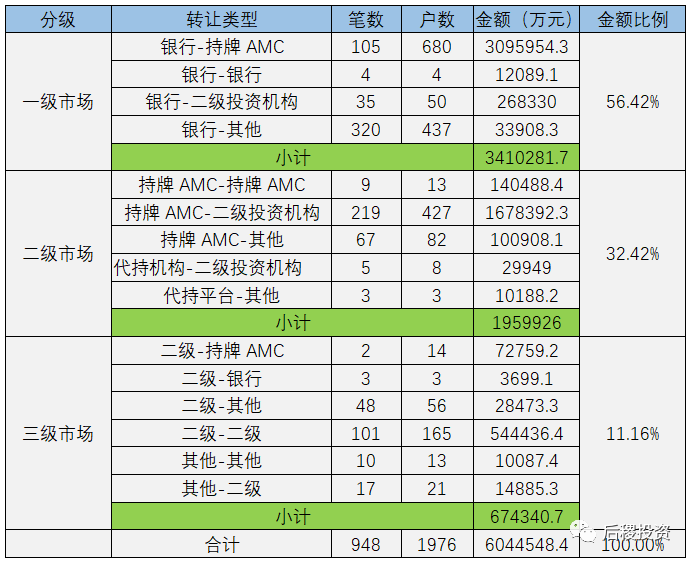 按慣例,我們將行業市場分為三級:銀行出讓債權為一級市場;本地持牌AMC或代持機構在當地出讓債權為二級市場,其余的債權轉讓為三級市場。