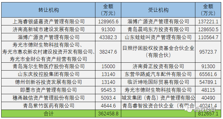 從出讓金額與受讓金額的對比中看,華融資管、山東金融、泰和資管、信達資管、東方資管受讓金額均大于出讓金額,則長城資管、青島資管受讓金額小于出讓金額。