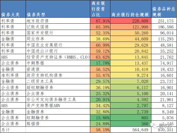 從整體風(fēng)格看,商業(yè)銀行的風(fēng)險(xiǎn)偏好較低,投資品種還是局限在利率債、金融債和信貸ABS這類品種上。信用品種在商業(yè)銀行的投資組合中只是九牛一毛。
