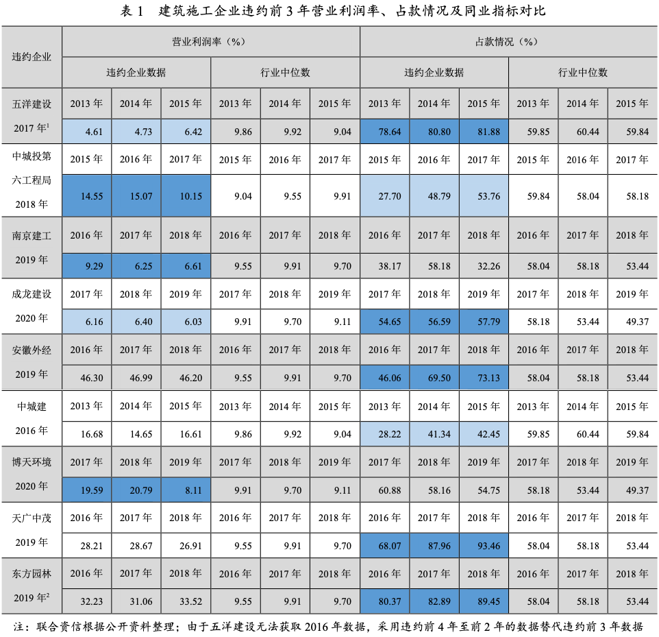 首支公開發(fā)行公司類信用債違約以來,信用債違約規(guī)模和支數(shù)近年來呈現(xiàn)快速增長態(tài)勢。從違約行業(yè)分布來看,違約債券余額較高的行業(yè)以周期性、過剩產(chǎn)能行業(yè)為主,兼具高負債水平等行業(yè)特點。建筑施工行業(yè)具備周期性強、行業(yè)準入門檻低、杠桿水平高等特點,在企業(yè)去杠桿、金融嚴監(jiān)管背景下,建筑施工企業(yè)信用風(fēng)險迅速累積,最終導(dǎo)致違約事件發(fā)生。本文從評級視角下,通過研究近年來違約和部分級別下調(diào)的建筑施工企業(yè),對其經(jīng)營管理和財務(wù)管控等方面進行分析,探尋并總結(jié)這類企業(yè)在流動性趨緊及市場需求增速放緩等外部環(huán)境影響下表現(xiàn)出來的共性特征,為未來判斷企業(yè)風(fēng)險提供參考。通過分析發(fā)現(xiàn),建筑施工違約企業(yè)產(chǎn)業(yè)鏈地位較低,具體表現(xiàn)包括:下游占款情況較為嚴重、回款效率較低;在違約前3年內(nèi)往往表現(xiàn)出盈利能力下滑、債務(wù)水平整體偏高、短期償債指標表現(xiàn)明顯低于行業(yè)中位數(shù)等特征。