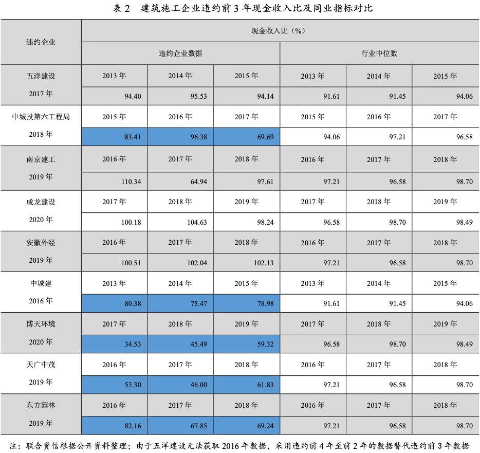 綜合來看,導(dǎo)致企業(yè)發(fā)生信用風(fēng)險的因素可以總結(jié)為外部環(huán)境(宏觀和行業(yè))的惡化和企業(yè)自身經(jīng)營及財務(wù)管理方面的問題。外部環(huán)境的惡化引發(fā)一系列內(nèi)部問題的加速暴露,行業(yè)整體景氣度的下行導(dǎo)致行業(yè)內(nèi)企業(yè)收入和利潤增速出現(xiàn)下滑及行業(yè)分化加劇,而宏觀杠桿調(diào)控背景下的一系列調(diào)控政策進一步加劇了末端企業(yè)的資金鏈斷裂風(fēng)險。從企業(yè)自身狀況分析,債務(wù)過重、財務(wù)彈性較弱的企業(yè)抗風(fēng)險能力往往較弱。債務(wù)高企情況下,一旦企業(yè)未對資金進行有效利用,疊加公司管理及周轉(zhuǎn)等方面的問題,極易引起企業(yè)資金鏈緊張,導(dǎo)致償債指標弱化,進而引發(fā)信用風(fēng)險。通過對違約企業(yè)共性特點具體分析發(fā)現(xiàn),除債務(wù)和償債指標表現(xiàn)弱化之外,建筑施工企業(yè)在違約前往往會出現(xiàn)盈利能力下降、占款程度加劇,運營效率降低、回款質(zhì)量不佳中的一個或多個現(xiàn)象。此外,企業(yè)實際控制人的變更,尤其涉及到企業(yè)性質(zhì)變化,對企業(yè)經(jīng)營穩(wěn)定性影響較大。民營企業(yè)往往處于融資鏈條的末端,更容易受到宏觀流動性邊際變化的沖擊。當然,部分企業(yè)財務(wù)造假帶來的表面繁榮同樣需要在風(fēng)險鑒別中給予重視。
