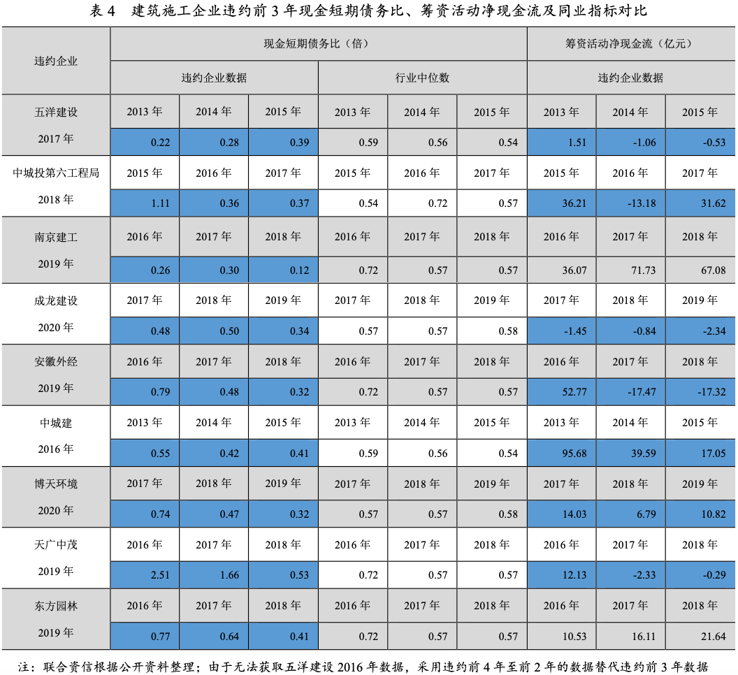 ②籌資活動凈現(xiàn)金流。一般來說,當一家企業(yè)籌資活動凈現(xiàn)金流逐漸減少甚至由正轉(zhuǎn)負,或融資成本明顯高于同行業(yè)可比公司時,敏感的金融機構(gòu)(尤其是對企業(yè)情況熟悉的當?shù)劂y行機構(gòu))會有所警惕,并采取積極的措施以降低其風(fēng)險,而該行為很有可能會傳導(dǎo)至更多的債權(quán)人。對于嚴重依賴于短債滾存的建筑施工企業(yè),融資渠道脆弱,受到?jīng)_擊的可能性更大。9家違約企業(yè)中,有7家均在違約前3年出現(xiàn)了籌資活動凈現(xiàn)金流下降的現(xiàn)象,其中3家大幅下降,安徽外經(jīng)甚至從大幅凈流入轉(zhuǎn)為大額凈流出,且這三家企業(yè)違約前3年,整個行業(yè)中呈現(xiàn)籌資性活動現(xiàn)金凈流出的企業(yè)并不占多數(shù)。