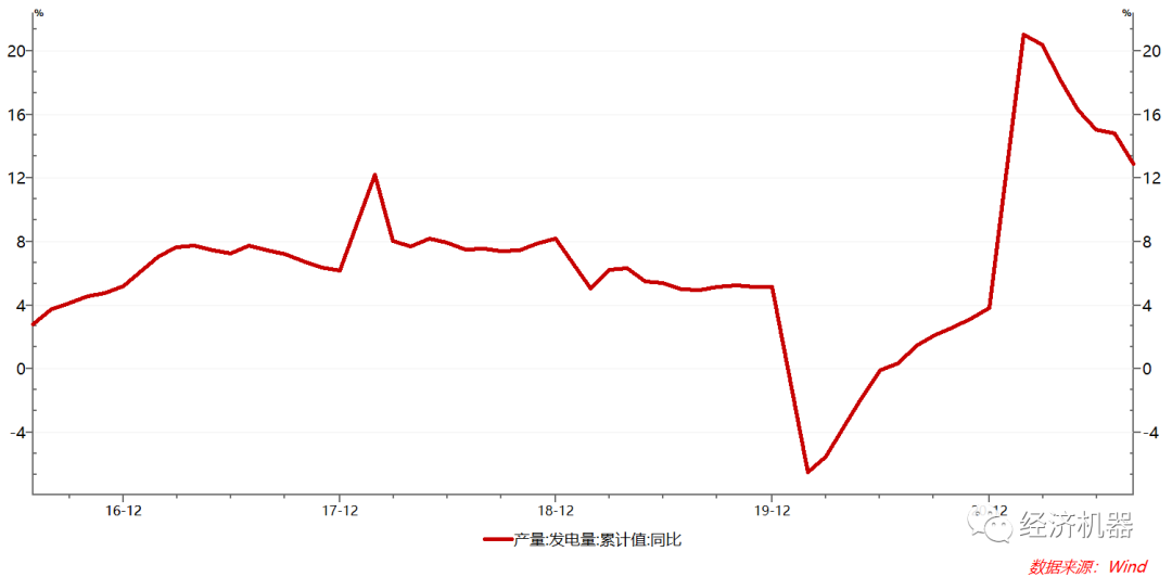 在出口和工業(yè)生產(chǎn)高景氣下,我國(guó)發(fā)電量也呈現(xiàn)明顯的“V”型反彈的態(tài)勢(shì),發(fā)電量累計(jì)同比增速?gòu)?020年最低的-8%,快速攀升至今年初的最高的19.5%,至今仍有11.3%的漲幅(圖5)。用電需求的暴跌和暴漲,既加劇了動(dòng)力煤價(jià)格的暴漲,也加劇了對(duì)電網(wǎng)的沖擊,使電力階段性短缺具有一定必然性。