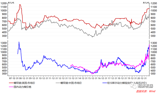 疫情。疫情對(duì)供給的沖擊體現(xiàn)在多個(gè)方面,一方面,由于供應(yīng)鏈的破壞,導(dǎo)致海外大宗商品漲幅比國(guó)內(nèi)更大,加劇了抑制大宗商品價(jià)格工作的難度,因?yàn)橐坏﹪?guó)內(nèi)打壓的厲害,企業(yè)就會(huì)通過(guò)出口進(jìn)行“套利”(圖8)。比如美國(guó)螺紋鋼價(jià)格超過(guò)了國(guó)內(nèi),而且價(jià)差有擴(kuò)大趨勢(shì);再比如,紐卡斯?fàn)杽?dòng)力煤價(jià)格超過(guò)180美元/噸,合人民幣突破1200元一噸。另一方面,由于人流、物流和貨船
