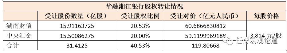 具體看,分別向湖南財信轉(zhuǎn)讓15.91163725億股(股權(quán)比例為20.53%),向中央?yún)R金轉(zhuǎn)讓15.50086275億股(股權(quán)比例為20.00%)。此次轉(zhuǎn)讓的每股價格為3.814元/股,整體上較其3.58元/股的凈資產(chǎn)略有溢價。