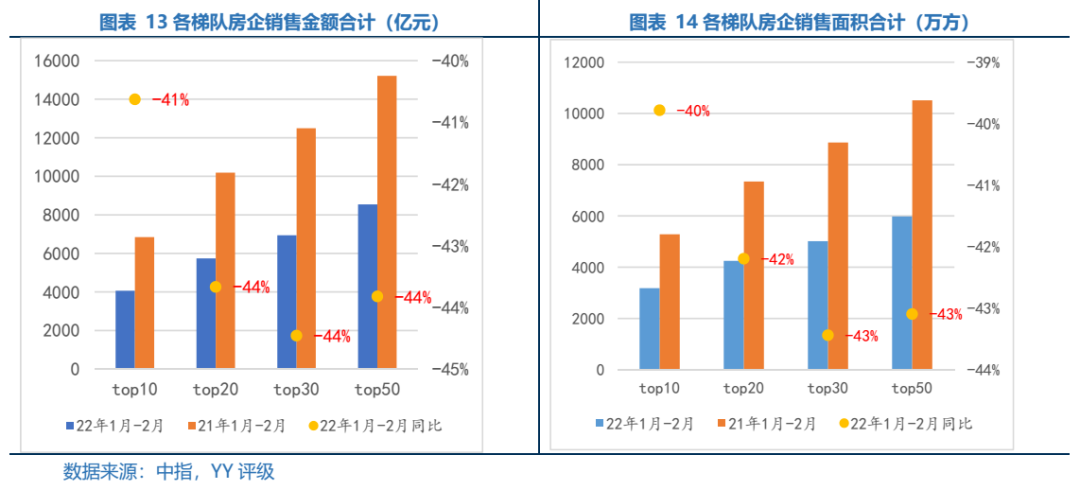 2022年1-2月全國TOP50銷售額同比下滑嚴重,但集中度圍繞著TOP10房企提高。集中度方面,TOP10銷售額占TOP50銷售額之比為47.55%,較去年同期上升了2.56%;銷售額方面,整體梯隊均下滑了約40%左右;銷售面積方面,整體梯隊亦下滑了40%左右。