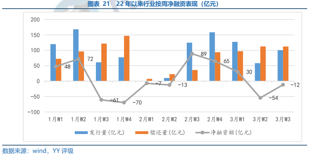 在債券發行層面,2022年1-2月的房地產債券發行量共計719.60億元,償還量為596.57億元,凈融資額為123.03億元。周度頻次看,資金仍處于流出地產狀態,風險偏好尚未修復,行業信心難以重建。