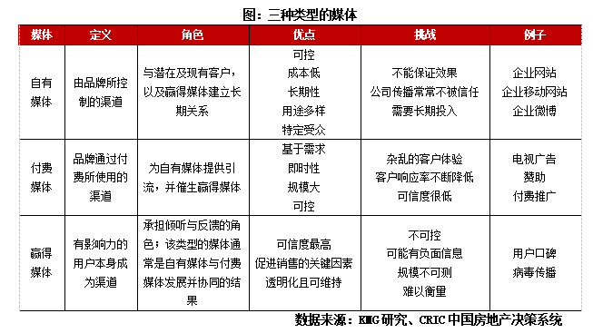 從數字到達的渠道分類,將媒體分為三類,即自有媒體(Owened media)、付費媒體(Paid media)和贏得媒體(Earned media),每種媒體都有不同的好處、應用方法和挑戰。自有媒體是指品牌自有的媒體,對房企而言,主要是自建小程序、微博、官方網站、APP等;付費媒體主要是推廣平臺,為企業付費使用的渠道,房企在數字時代營銷付費媒體主要有房產中介門戶網站、電視廣告、付費媒體廣告;贏得媒體是一個公關用來宣傳的媒體,即有影響力的用戶本身成為渠道。如用戶口碑、社交網絡傳播等方式。企業需要充分研究不同渠道潛在客戶轉化率,選擇更加高效的方式來促進交易。