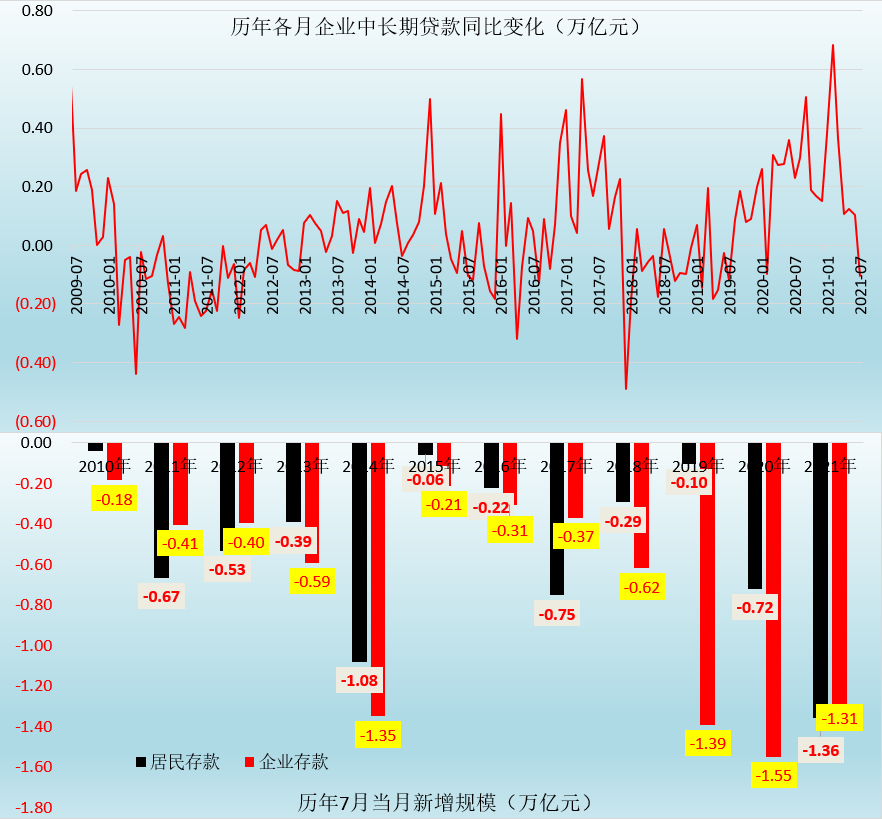 歷年7月的客戶存款一般均會呈現大幅減少的季節性,如2017-2020年的7月,居民存款分別減少0.75萬億、0.29萬億、0.10萬億、0.72萬億和1.36萬億,企業存款分別減少0.37萬億、0.62萬億、1.39萬億、1.55萬億和1.31萬億。但是就今年7月來,居民存款的低迷又明顯超預期,這應與居民貸款低迷、貸款派生存款力度明顯減弱有關。