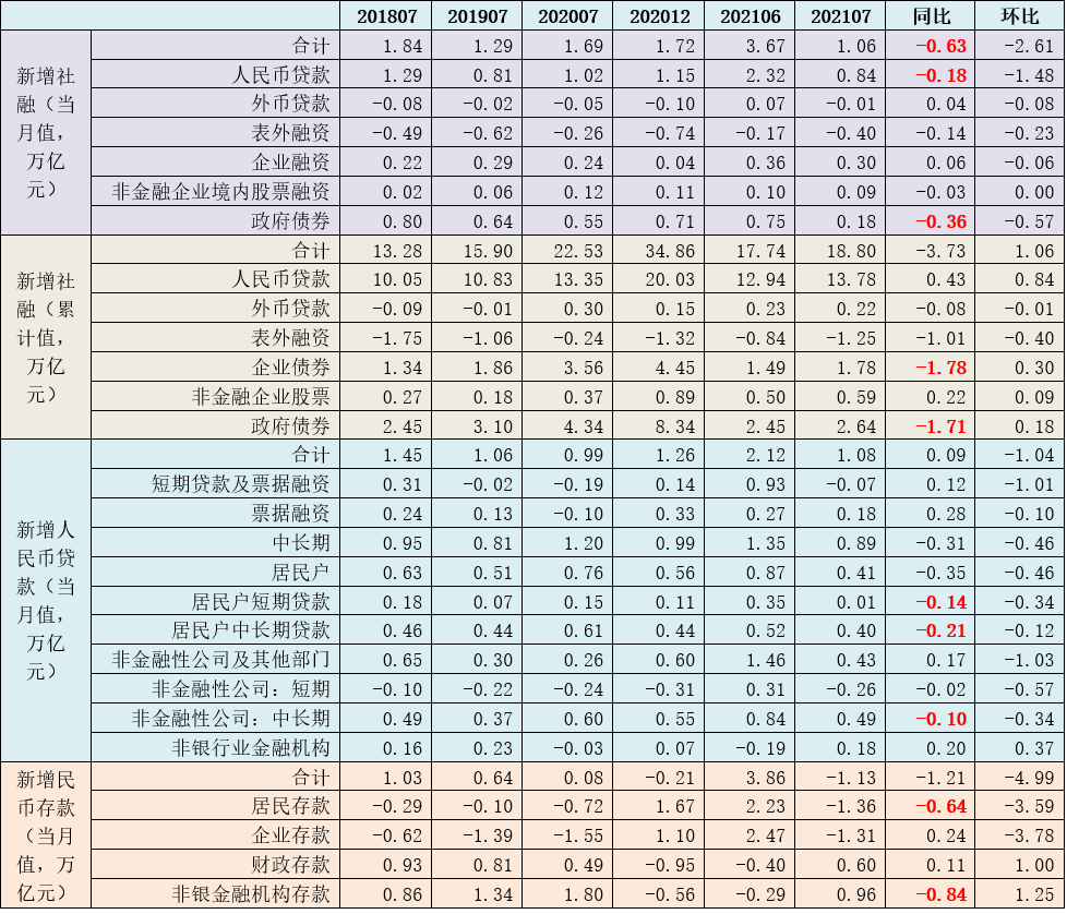 2021年7月,新增社會融資規模達到1.06萬億,同比和環比分別大幅少增0.63萬億和2.61萬億。其中,新增人民幣貸款、新增未貼現票據和新增政府債券同比分別少增0.18萬億、0.12萬億和0.36萬億,三者合計共拖累社融少增0.66萬億,可以看出政府債券拖累最為明顯,主因應是政府發行節奏放緩。