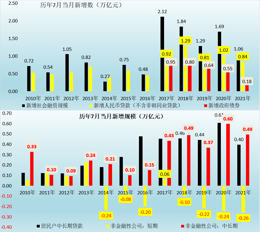 那么央行短期內會不會放松政策來支撐社融呢?我們認為央行可能還會觀察一段時期,再等等看。因為從央行的視角來看,今年1-7月新增社融和新增人民幣貸款分別達到18.80萬億和13.78萬億,雖然較2020年同期分別少增-3.73萬億和多增0.43萬億,但較2019年同期仍分別多增2.90萬億和2.95萬億,因此絕對值上看似乎并不低?,F在市場可能更關心的是,監管政策層面會不會有所放松?如地產和城投政策層面,目前來看這種可能性應該是存在的,雖然不會允許新增,但基于存量債務化解的信貸支持應該是有商量空間的,畢竟若實體經濟出現流動性危機,屆時再出手拯救的難度會大幅提升。