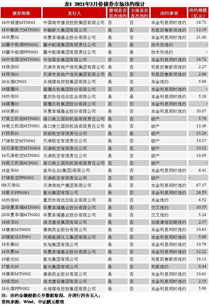 2021年3月,新增違約主體3家,分別是西部航空有限責任公司、重慶協信遠創實業有限公司、冀中能源集團有限責任公司。