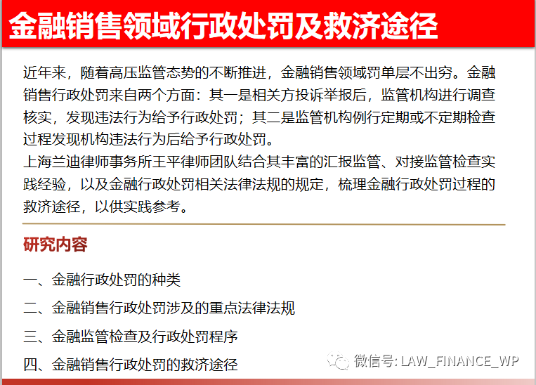 近年來,隨著高壓監(jiān)管態(tài)勢(shì)的不斷推進(jìn),金融銷售領(lǐng)域罰單層不出窮。金融銷售行政處罰來自兩個(gè)方面:其一是相關(guān)方投訴舉報(bào)后,監(jiān)管機(jī)構(gòu)進(jìn)行調(diào)查核實(shí),發(fā)現(xiàn)違法行為給予行政處罰;其二是監(jiān)管機(jī)構(gòu)例行定期或不定期檢查過程發(fā)現(xiàn)機(jī)構(gòu)違法行為后給予行政處罰。行政處罰的救濟(jì)途徑包括檢查期間溝通、聽證程序、行政復(fù)議及行政訴訟,每個(gè)階段有各種特點(diǎn),進(jìn)而也有對(duì)應(yīng)的溝通技巧。本次研究報(bào)告的內(nèi)容如下: