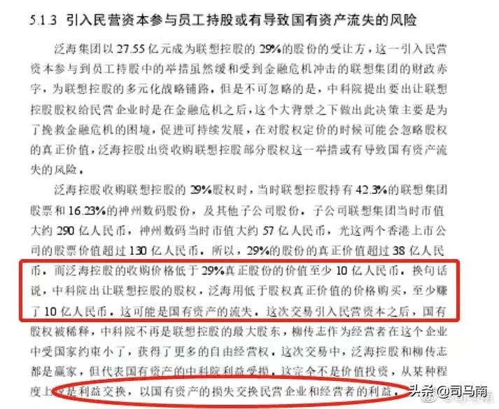 “如果司馬南的質疑不夠專業、不夠分量,那么這篇學術論文里所提出的聯想控股09年改制中涉嫌至少10億國資流失的質疑,夠不夠專業呢?”