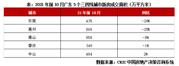 廣東其他三四線城市前10月新房成交跌多漲少,東莞、惠州累計(jì)跌幅超過(guò)25%。5個(gè)廣東城市中,除中山前10月新房成交同比微增2%外,其余4個(gè)城市成交規(guī)模均不及去年同期,東莞、佛山、東莞累計(jì)跌幅居前,作為環(huán)廣深城市,其市場(chǎng)走勢(shì)也和核心城市有所趨同。