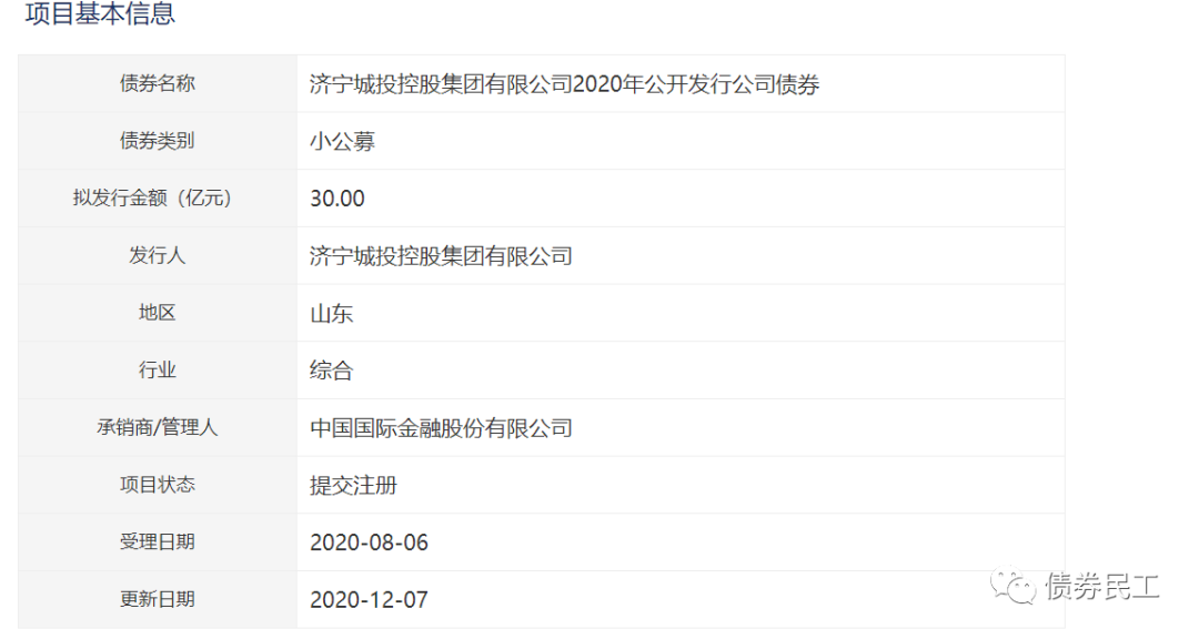2、濟(jì)寧城投控股集團(tuán)有限公司于2020年12月10日提交的面向?qū)I(yè)投資者公開(kāi)發(fā)行公司債券被終止,債券擬發(fā)行金額為30億元。濟(jì)寧城投控股集團(tuán)有限公司的實(shí)際控制人為濟(jì)寧市國(guó)資委,主體信用評(píng)級(jí)為AA+(中誠(chéng)信國(guó)際、大公國(guó)際和中證鵬元),目前存續(xù)債券金額為154.50億元,存續(xù)債券只數(shù)17只,存續(xù)債券產(chǎn)品包括公司債券、企業(yè)債券和債務(wù)融資工具。