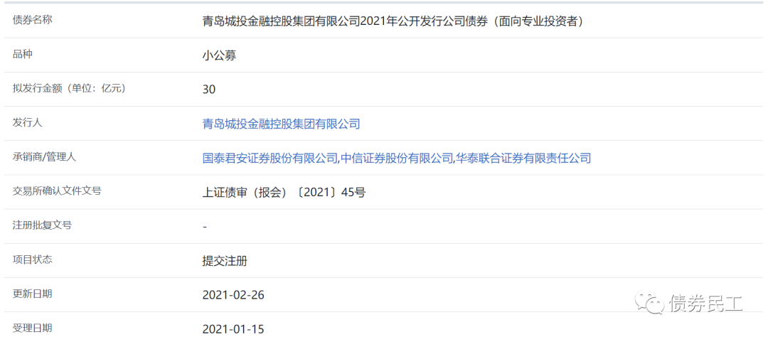 上述終止的公司債券項(xiàng)目中,值得關(guān)注的是青島城投金融控股集團(tuán)有限公司,2021年3月2日申報(bào)的2021年公開(kāi)發(fā)行公司債券(面向?qū)I(yè)投資者)被終止,債券擬發(fā)行金額為30億元。