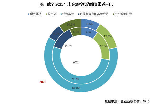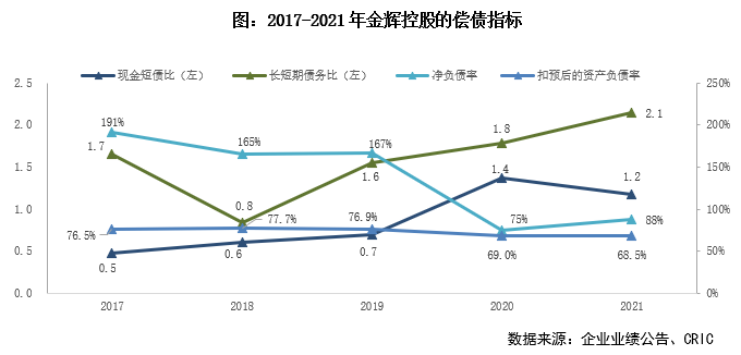 截至2021年末金輝有息負(fù)債527.94億元,較年初減少1.82%,其中短債規(guī)模同比大幅減少13.03%至167.97億元,短債占比下降至31.81%,債務(wù)結(jié)構(gòu)有所優(yōu)化,但仍有進(jìn)一步的提升空間。金輝持有現(xiàn)金較年初減少25.81%至197.28億元(已抵押存款占比4.31%),降幅較大但可動(dòng)用現(xiàn)金基本覆蓋短債。期末金輝“三條紅線”指標(biāo)維持綠檔,現(xiàn)金短債比1.17,凈負(fù)債率較年初增加12.7pct至88%,剔除預(yù)收后的資產(chǎn)負(fù)債率改善至68.5%。