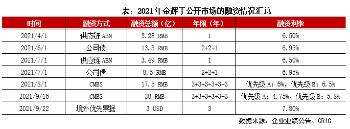 信用風(fēng)險(xiǎn)減少和融資渠道通暢,一定程度反映在金輝2021年新發(fā)行的債券上。全年金輝于公開市場(chǎng)融資活躍,上半年成功發(fā)行2021年第一期小公募和第一期供應(yīng)鏈ABN ,7-8月成功發(fā)行2021年第二期小公募、第二期供應(yīng)鏈ABN以及CMBS,9月發(fā)行一筆CMBS以及境外優(yōu)先票據(jù),融資渠道逐漸拓展。年內(nèi)金輝加權(quán)平均融資成本6.58%,較去年同期的7.47%改善顯著。截至2021年末,三大國(guó)際評(píng)級(jí)機(jī)構(gòu)均維持金輝控股長(zhǎng)期發(fā)行人主體評(píng)級(jí)不變,標(biāo)普給予B+/穩(wěn)定,穆迪B1/穩(wěn)定,惠譽(yù)B+/穩(wěn)定。
