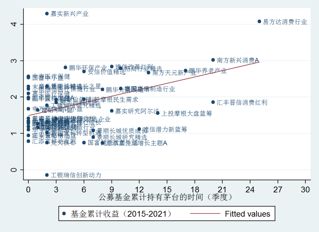 圖1 股票基金持有茅臺(tái)的時(shí)間與基金業(yè)績(jī)