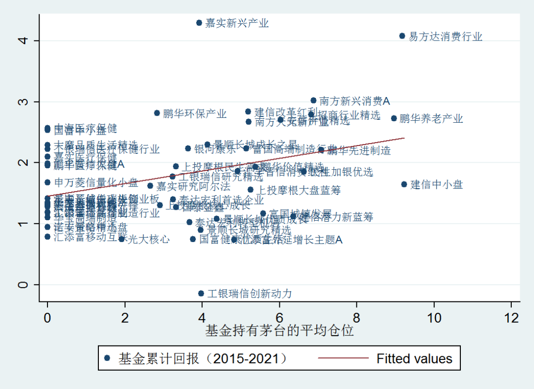 圖2 股票基金持有茅臺(tái)的平均倉(cāng)位與基金業(yè)績(jī)