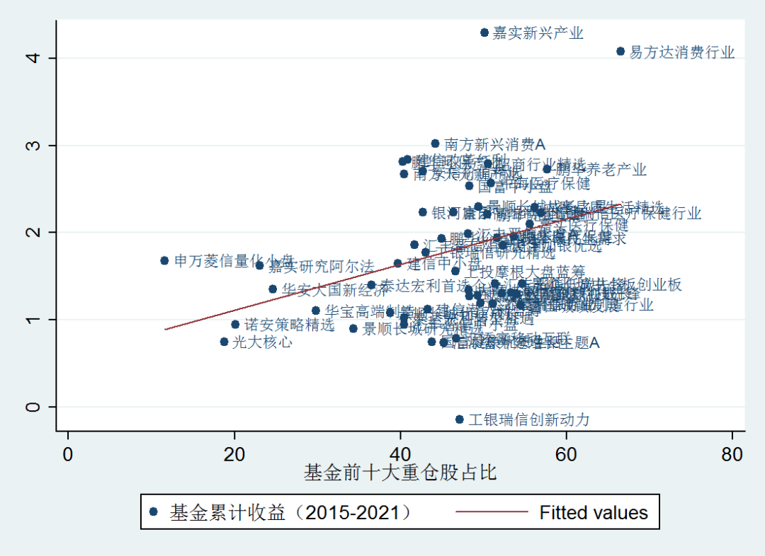 圖3 股票基金前十大重倉(cāng)股占比與基金業(yè)績(jī)
