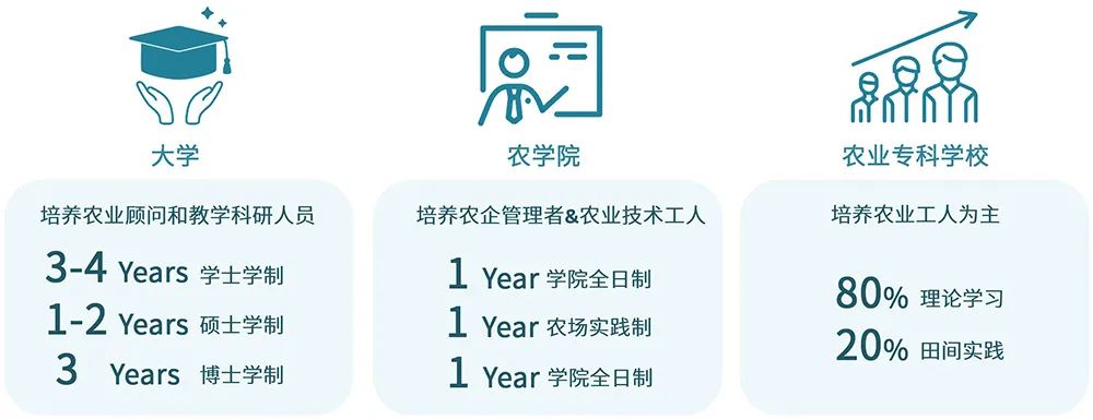 英國在成立培養(yǎng)農(nóng)業(yè)顧問和教學(xué)科研人才為主的農(nóng)業(yè)大學(xué)之余,更成立了培養(yǎng)專業(yè)「農(nóng)企管理者」和「農(nóng)業(yè)技術(shù)工人」的農(nóng)學(xué)院,以及以培養(yǎng)兼具農(nóng)業(yè)基礎(chǔ)知識和田間實(shí)踐的「農(nóng)業(yè)工人」為目標(biāo)的農(nóng)業(yè)專科學(xué)校,確保農(nóng)村人才適應(yīng)現(xiàn)代化農(nóng)業(yè)生產(chǎn)。