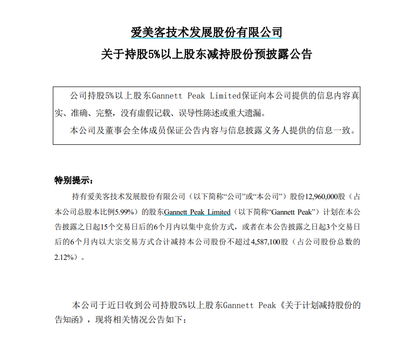 10月8日,愛美客發布持股5%以上股東擬減持公告,公告顯示, 持有愛美客1296萬股(占公司總股本比例為5.99%)的股東Gannett Peak Limited計劃在公告披露之日起15個交易日后的6個月內以集中競價方式,或者在公告披露之日起3個交易日后的6個月內以大宗交易方式合計減持公司股份不超過約458.7萬股(占公司股份總數的2.12%)。若按照當日股價計算,這部分總額超過27億人民幣。