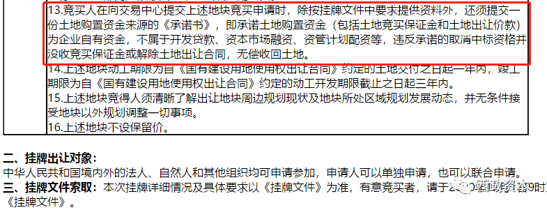 根據(jù)目前的招拍掛政策,大部分地區(qū)的國(guó)土、自然資源等部門(mén)都會(huì)在招拍掛公告中明確要求競(jìng)拍人的資金必須為自有資金,其中個(gè)別地區(qū)的國(guó)土部門(mén)還會(huì)穿透核查競(jìng)拍主體的資金來(lái)源。從實(shí)務(wù)的情況來(lái)看,各地對(duì)競(jìng)拍主體自有資金的核查要求差異比較大,比如有的地方僅僅是形式核查或要求競(jìng)拍主體提交《承諾函》即可,而有些城市則會(huì)穿透核查支付競(jìng)拍保證金、土地款的項(xiàng)目公司的股東的性質(zhì),其中若股東名稱(chēng)中含有資產(chǎn)管理、投資管理、基金、信托、金控等字樣的,則有可能被認(rèn)定為拍地資金屬于融資類(lèi)資金。以下為2020年11月20日《珠海市國(guó)有建設(shè)用地使用權(quán)網(wǎng)上掛牌出讓公告》的規(guī)定示例: