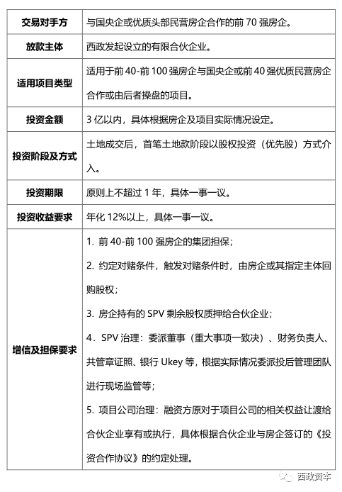 (2)投資前提條件:融資方最好為前40-前100強(qiáng)房企,適用于該前100強(qiáng)房企與國(guó)央企或經(jīng)認(rèn)可的前40強(qiáng)優(yōu)質(zhì)民營(yíng)房企合作開(kāi)發(fā)類項(xiàng)目;合伙企業(yè)在項(xiàng)目交完土地保證金后介入,其中前融資金可根據(jù)項(xiàng)目實(shí)際情況與開(kāi)發(fā)貸并存;融資方原對(duì)于項(xiàng)目公司的相關(guān)權(quán)益讓渡給合伙企業(yè)享有或執(zhí)行,具體根據(jù)合伙企業(yè)與房企簽訂的《投資合作協(xié)議》的約定處理。