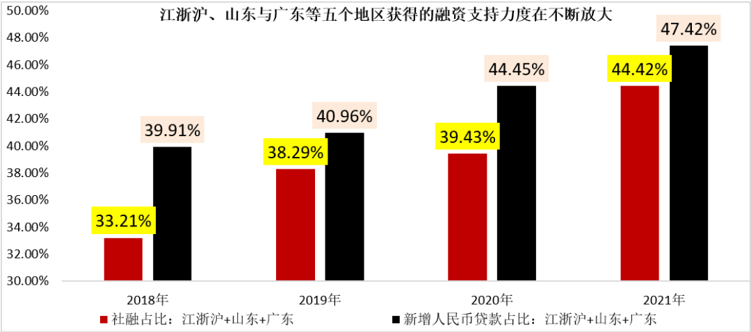 (一)五個地區(qū)合計(jì)獲得了全國44%以上的社融和47%以上的貸款支持