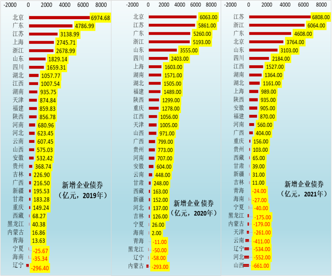 相較于貸款,從各地區(qū)歷年企業(yè)債券的新增情況上也許更能看出市場對該地區(qū)的評價好壞,畢竟企業(yè)債券的市場化程度更高、參與主體更豐富、評價更客觀。