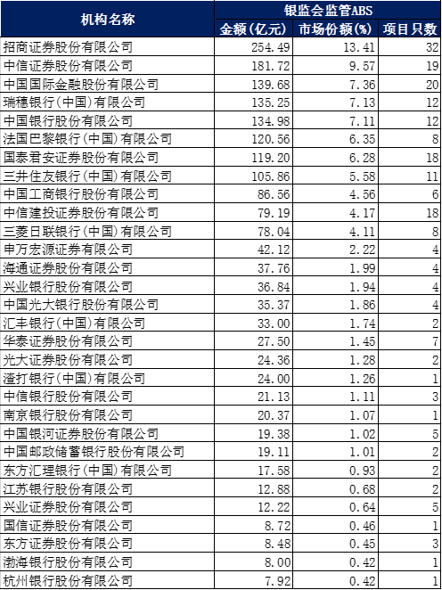 2022年1-7月份,銀保監會主管ABS承銷排名靠前的機構分別為招商證券、中信證券、中金公司、瑞穗銀行和中國銀行,承銷金額分別為254.49億元、181.72億元、139.68億元、135.25億元和134.98億元。前五大、前十大和前二十大承銷商市場份額占比分別為44. 57%、71.51%和90.49%。