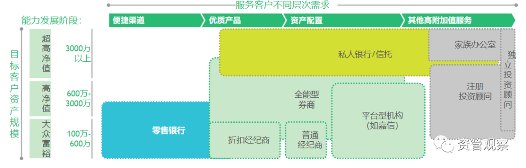 財富管理需求既與個人所處的生命階段有很大關系,也與其所處的財富階層有很大關系。當然,二者并不是完全獨立的,生命周期是時間縱軸的視角,而財富階層是特定時期的橫切面角度,個人不同生命周期所對應的財富階層可能有所差異,因此理想的財富管理模式,是跟隨客戶生命周期,基于其所處的財富階層提供更加貼合的產品服務。