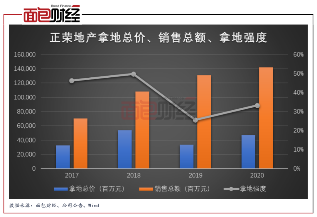報(bào)告期內(nèi),正榮地產(chǎn)新增土地儲備2.5百萬平方米,同比增長約25%;拿地總價(jià)472.21億元,同比增長41.38%。拿地強(qiáng)度方面,在金額口徑下,公司2020年拿地強(qiáng)度為33.28%,同比上升7.73個百分點(diǎn)。