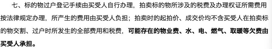 欠費(fèi)情況:水電物業(yè)欠費(fèi)情況,到物業(yè)去核實(shí),競(jìng)買(mǎi)公告一般說(shuō)的是全部由買(mǎi)受人承擔(dān);