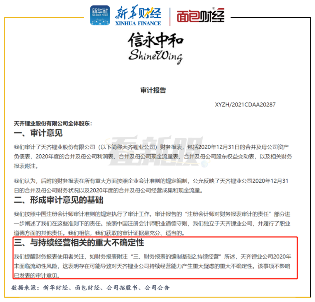天齊鋰業(yè)的審計(jì)師信永中和在2019年和2020年出具的審計(jì)報(bào)告中,均提及公司“面臨流動性風(fēng)險(xiǎn),這表明存在可能導(dǎo)致對天齊鋰業(yè)公司持續(xù)經(jīng)營能力產(chǎn)生重大疑慮的重大不確定性”。