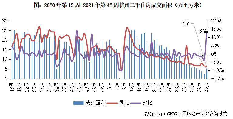 2021年第42周,杭州二手住房環比漲123%,同比下降75%,成交規模收5.0萬平方米。自4月高位以來杭州市場規模持續震蕩下行,政策調控下市場規模持續降級,本周規模低位回升但仍處底部,后續規?;虺掷m震蕩。