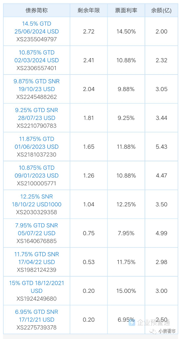 《小債看市》統(tǒng)計,目前花樣年控股存續(xù)11只美元債,存續(xù)規(guī)模36.59億美元,其中有13.5億美元債將于一年內(nèi)到期,其面臨短期集中兌付壓力較大。